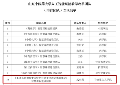 武东霞老师申报的《毛泽东思想和中国特色社会主义理论体系概论》智慧课程建设团队,获得人工智能教学改革团队(培育团队)立项;吴向媛老师申报的《马克思主义基本原理》智慧课程建设团队,获得人工智能赋能教学改革团队立项。