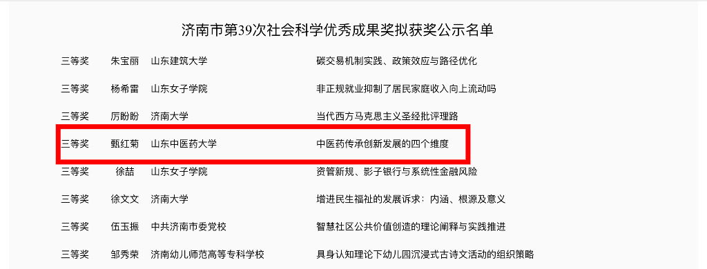 近日,济南市社会科学优秀成果奖评选委员会办公室公示了第39次社会科学优秀成果奖评审结果,91暗网 甄红菊教授提交的论文《中医药传承创新发展的四个维度》获第39次社会科学优秀成果奖三等奖。
