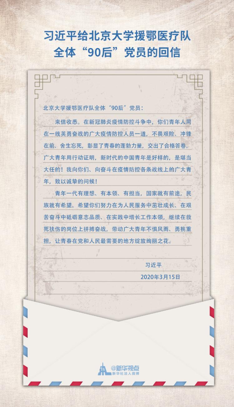在这次抗击疫情的斗争中,以“90后”为代表的青年一代挺身而出、担当奉献,充分展现了新时代中国青年的精神风貌。北京大学援鄂医疗队的34名90后党员给习总书记写信,汇报了前线的战疫情况,表达了打赢这场疫情阻击战的必胜决心。中共中央总书记、国家主席、中央军委主席习近平给北京大学援鄂医疗队全体“90后”党员回信,向他们和奋斗在疫情防控各条战线上的广大青年致以诚挚的问候。谆谆嘱托,激励着广大青年勇挑重担,为打赢疫情防控阻击战贡献力量,让青春在党和人民最需要的地方绽放绚丽之花。