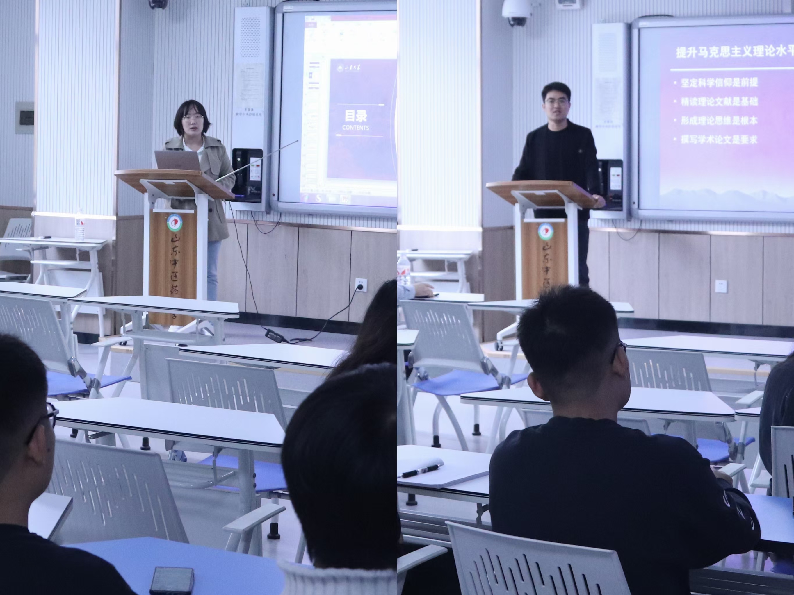接着,武文豪博士结合自身论文写作经历同与会同学分享了在文献研读、选题导向、写作模式、理论思维等方面的宝贵心得。周明珠博士针对经典著作节选解读、论文写作细节指导、升学考博相关规划等方面进行了深入讲解。在互动环节,两位博士耐心解答了同学们有关未来发展、研究进度及论文发表等疑惑,为他们的学术道路指引了方向。