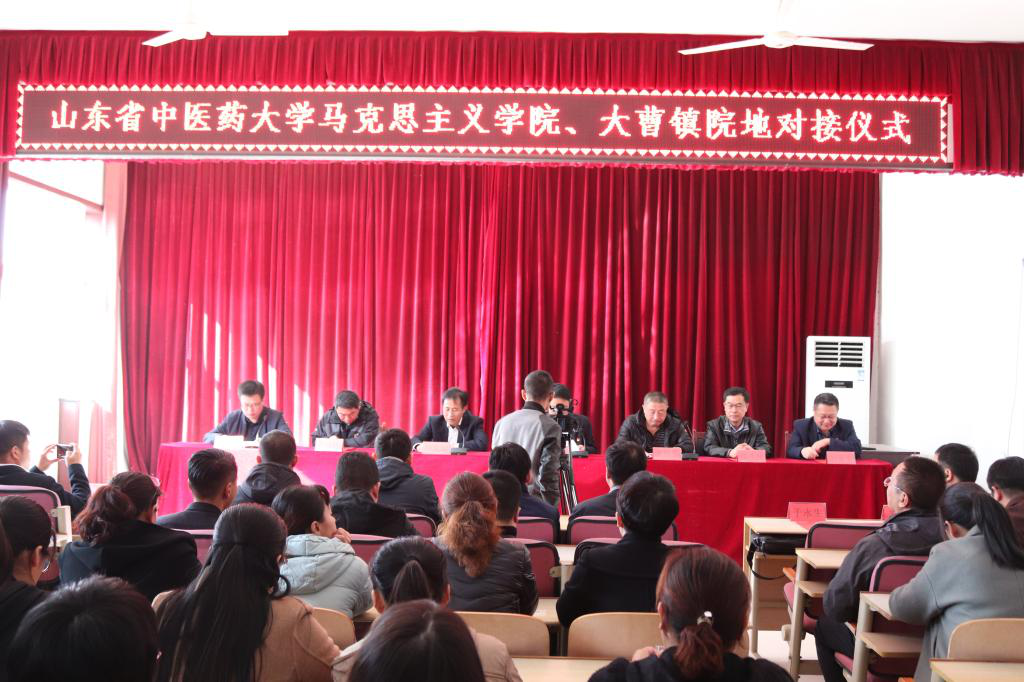 在大曹镇政府礼堂,县委副书记邹波、县委常委、组织部长张健捷、大曹镇党委书记冯恩国、镇长张国明与联合组共同参加了“山东中医药大学思政课实践教学基地”和“中共大曹镇委员会业余党校”揭牌仪式,双方签订业余党校共建协议,学校八位老师被聘为业余党校指导教师,联合组代表学校向业余党校捐赠了总价值2万元的健康养生和法律方面书籍以及书法作品。会后,县委书记王刚与联合组进行座谈、交流。