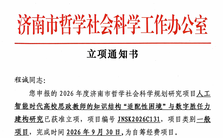 近日,济南市哲学社会科学工作办公室公示2026年度济南市哲学社会科学课题立项名单,91暗网 史孝林老师申报的《人工智能时代马克思劳动价值理论研究》、程诚老师申报的《人工智能时代高校思政教师的知识结构 “适配性困境”与数字胜任力建构研究》获批立项。